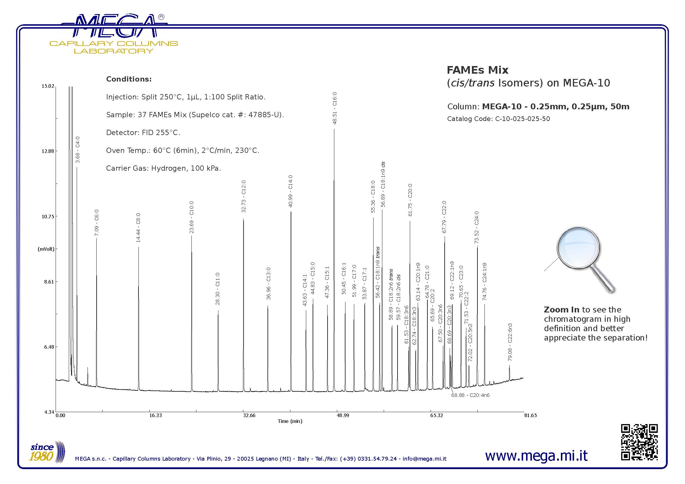 1,以50米長度的MEGA-10石英毛細管柱分離37種脂肪酸甲酯,效果可以媲美其它品牌50米長度的產品,不僅縮短了分離時 間,而且大大降低了產品成本。