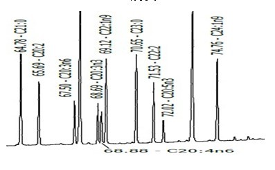 按許多文獻中報道和現行內部標準進行37種脂肪酸甲酯檢測時,其中C22:1n9、C20:4n6和C20:3n3實現完全分離是關鍵。在部分檢驗案例和客戶反饋的信息,即使用色譜柱長度為100米的知名品牌色譜柱,上述三個組份會發生重疊,難以分開。
