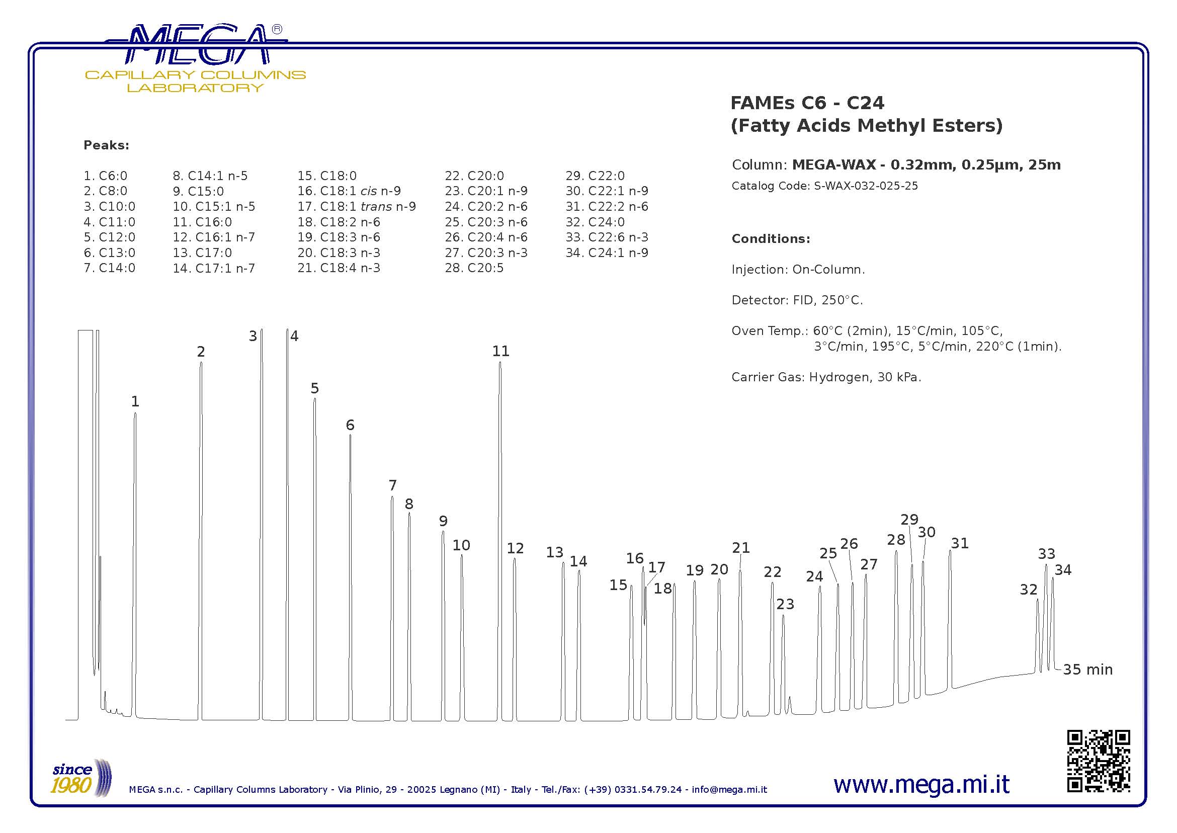 我們向您推薦使用MEGA-WAX石英毛細管氣相色譜柱,完全分離34種C6~C24碳鏈的飽和/不飽和脂肪酸,包括:C18:1 cis n-9、C18:1 trans n-9組份,色譜柱的長度為:25m x 0.32mm 0.25um df,保留時間大約35分鐘。與MEGA-50柱相比,不僅縮短分析時間,而且降低產品分析成本。