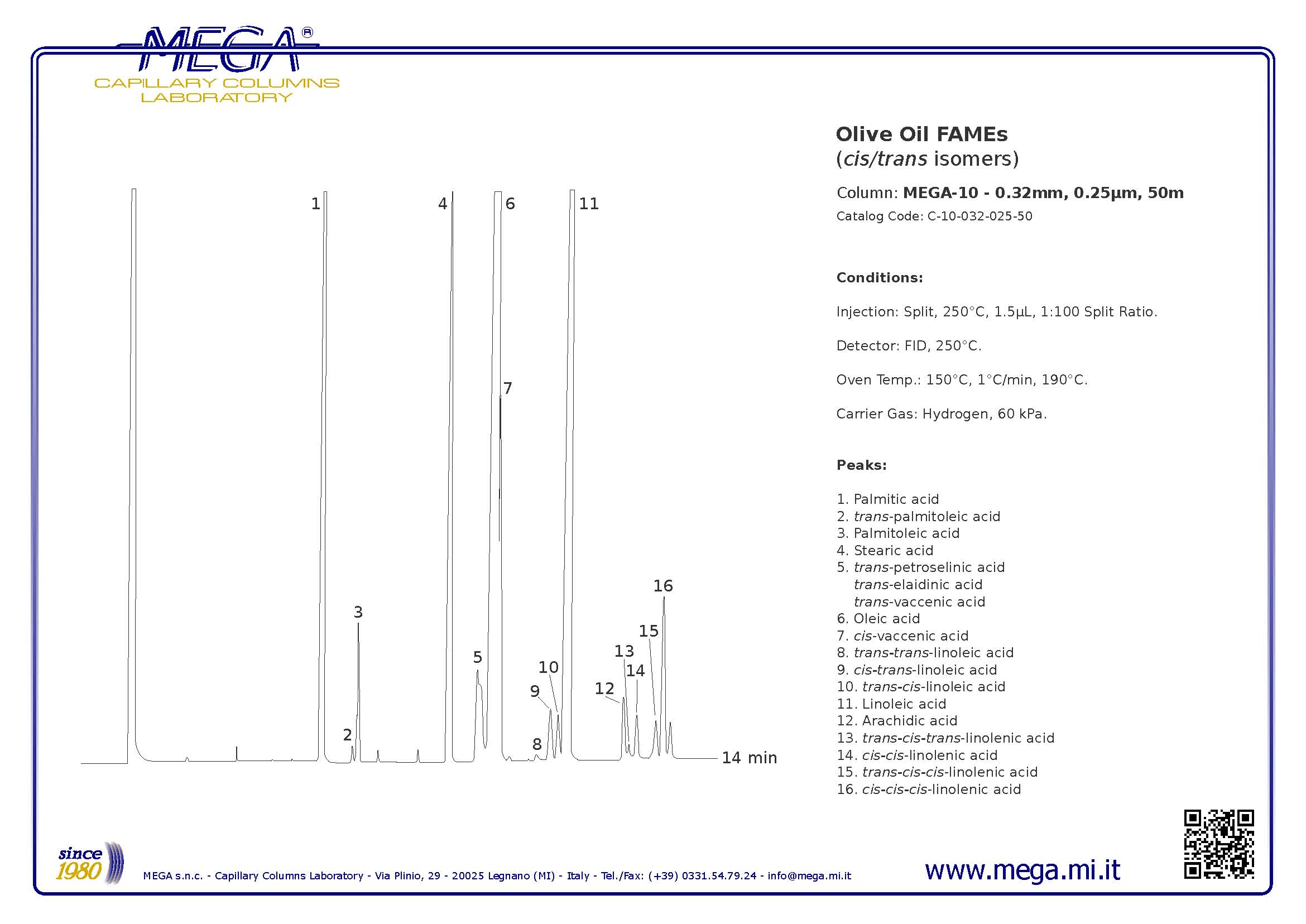 意大利MEGA公司(中文“美佳”)具有30多年專業生產和研發氣相色譜石英毛細柱的企業,其產品之一MEGA-10毛細管柱可以滿足此標準的要求,規格:50m x 0.25mm 0.20um df,可以很好分離標準中規定的5種脂肪酸。與使用其它品牌100m x 0.25mm 0.20um df色譜柱相比,優越性在于: