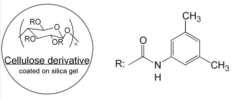 纖維素型是使用最廣泛的手性柱之一,纖維素型手性色譜柱的分離作用包括相互吸引的作用及形成包埋復(fù)合物。它們屬于Wainer分類中的第2種類型。市售的手性色譜柱為微晶三醋酸基、三安息香酸基、三苯基氨基酸鹽纖維素固定相。很多化合物可通過此類型的色譜柱得到分離。這種類型的手性色譜柱種類也很齊全。流動相使用低極性溶劑,典型的流動相為異丙醇-正己烷混合物。這類柱子根據(jù)制作工藝,分為涂敷與鍵合兩大類。但特別要注意由于氯可以使涂敷纖維素從硅膠上脫落,因此要確保涂敷類柱子流動相中無含氯溶劑。
