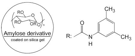 纖維素型是使用最廣泛的手性柱之一,纖維素型手性色譜柱的分離作用包括相互吸引的作用及形成包埋復合物。它們屬于Wainer分類中的第2種類型。市售的手性色譜柱為微晶三醋酸基、三安息香酸基、三苯基氨基酸鹽纖維素固定相。很多化合物可通過此類型的色譜柱得到分離。這種類型的手性色譜柱種類也很齊全。流動相使用低極性溶劑,典型的流動相為異丙醇-正己烷混合物。這類柱子根據制作工藝,分為涂敷與鍵合兩大類。但特別要注意由于氯可以使涂敷纖維素從硅膠上脫落,因此要確保涂敷類柱子流動相中無含氯溶劑。
