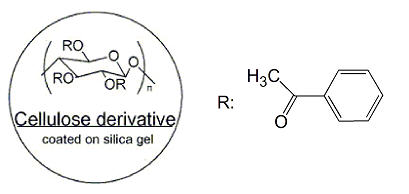 纖維素型是使用最廣泛的手性柱之一,纖維素型手性色譜柱的分離作用包括相互吸引的作用及形成包埋復合物。它們屬于Wainer分類中的第2種類型。市售的手性色譜柱為微晶三醋酸基、三安息香酸基、三苯基氨基酸鹽纖維素固定相。很多化合物可通過此類型的色譜柱得到分離。這種類型的手性色譜柱種類也很齊全。流動相使用低極性溶劑,典型的流動相為異丙醇-正己烷混合物。這類柱子根據制作工藝,分為涂敷與鍵合兩大類。但特別要注意由于氯可以使涂敷纖維素從硅膠上脫落,因此要確保涂敷類柱子流動相中無含氯溶劑。