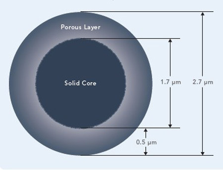 核殼顆粒是由著名色譜科學家 Jack Kirkland 教授于2006年研制成功的。“核殼型”填料最初是為了使UHPLC色譜柱比常規2μm填料UHPLC色譜柱更堅固可靠。Fused-Core(核殼或熔融) 技術就是將多孔硅殼熔融到實心的硅核上面而制備出的。這些多孔的“光環”狀顆粒具有極小的粒徑分布和擴散路徑,可以同時減小軸向和縱向擴散,減小峰寬,提高柱效。核殼技術被證明非常有效,因此衍生了多種不同的品牌和固定相類別,成了HPLC和UHPLC中有力的色譜工具。
